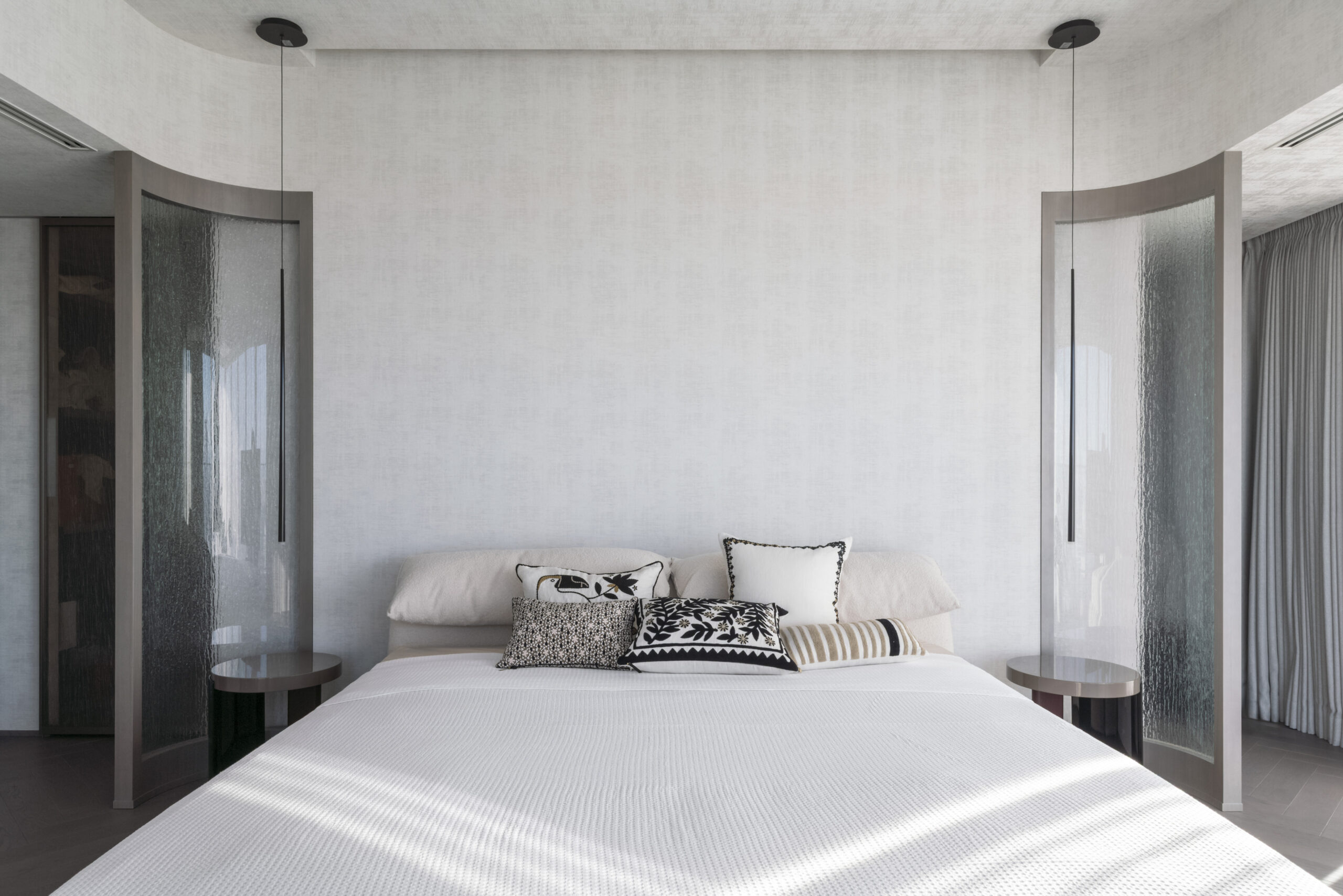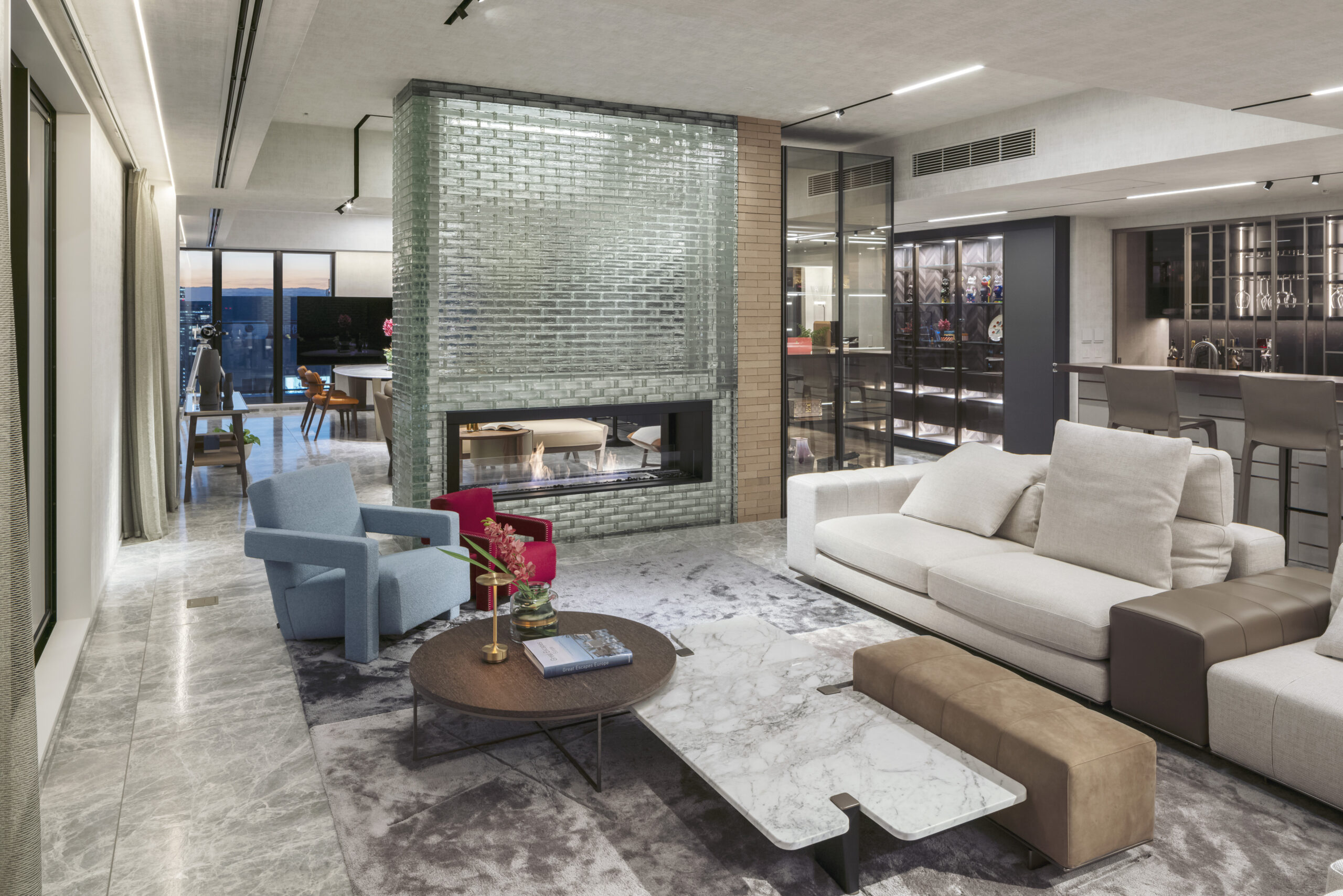 プロジェクト名「KODOU」は鼓動を意味し、心が高鳴る瞬間のビートを表現しています。お客様の想いと哲学をデザインコンセプトに落とし込み、インテリアへと昇華させました。またMinotti、B&B Italia、Molteni &Cなどのイタリア製の家具をメインに選び、クリスタル煉瓦とEcoSmart Fireを採用し、ワクワク感と、心臓がトクトクと音を立ててときめく、遊び心のあるデザインを目指しました。