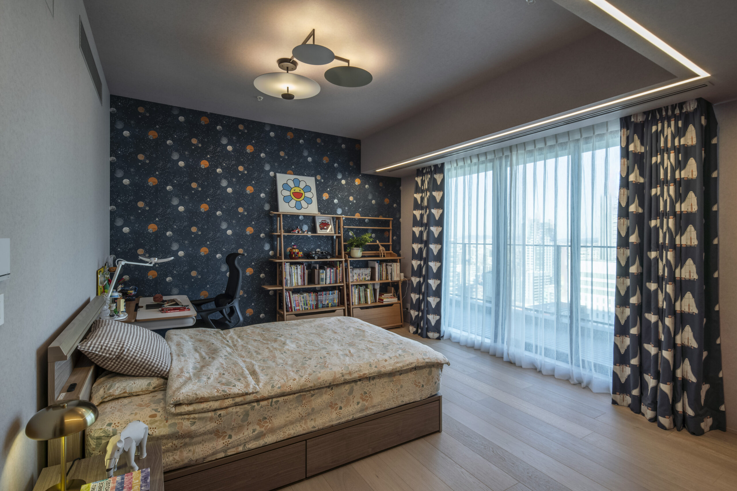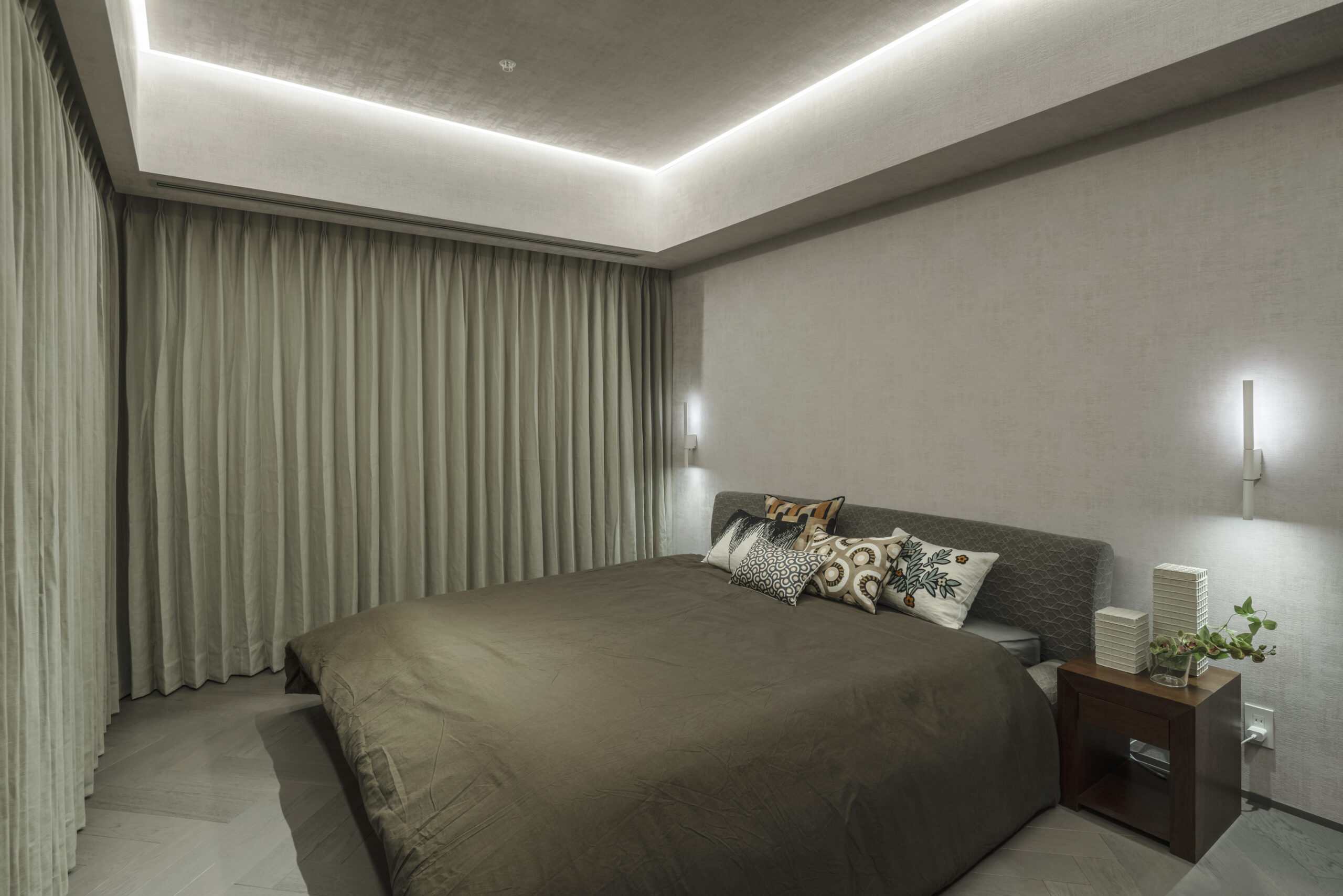 日々の生活においてストレスを軽減し、より快適な暮らしを実現するために、最先端の機器を使用して機能性においても細部までこだわった設計にしました。具体的には、IOTでスマートホーム一括管理&操作を計画し、iPad3と iPhone4台で全体をコントロール出来るようにしました。天井照明では、間接照明やダウンライトを使わず、ライン照明を採用し、グレアレスかつメリハリのある空間の実現を目指しました。